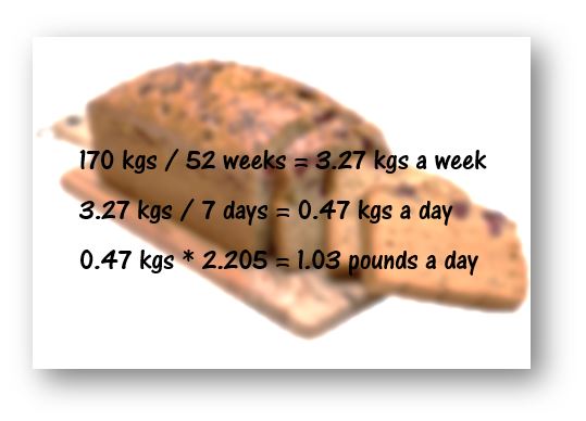 One-hundred and seventy kilograms a year is a little over three kilograms a week. About half a kilogram a day. Slightly more than a pound on the Imperial scale. We toss the equivalent of four hamburgers every day. Or twelve slices of bread: Essentially, I’m incinerating a loaf. Without getting to see cool pyrotechnics.