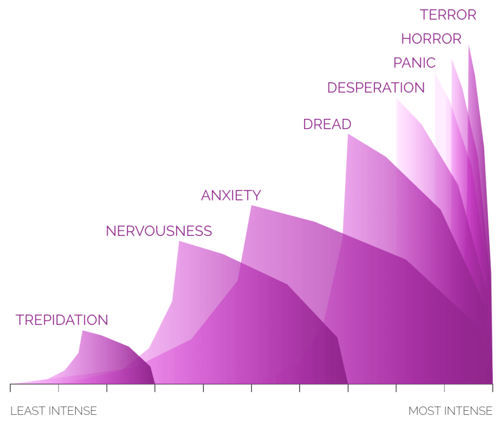 Fear isn’t all or nothing. It’s not a light switch, and it’s not always zero to one hundred in a finger snap. Fear is a continuum, a gradient full of language that can pinpoint our position between chill and terrified. Where we are on that scale also influences how well we cope. The closer we get to terror, the harder it gets to respond effectively. [v]