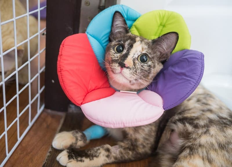 (I didn’t try the cone with my cat. I fashioned a clothing barrier after her surgery instead. Trying to put a cone on her would result in much bleeding. Mine.)