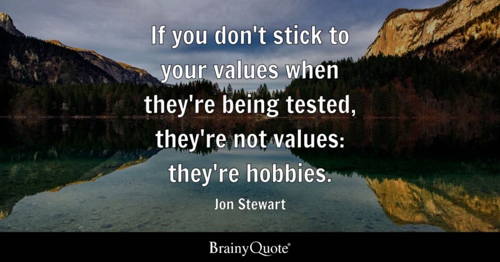What is it that Jon Stewart said – “If you don’t stick to your values when they’re being tested, they’re not values, they’re hobbies.” We can agree to disagree only until we can’t.